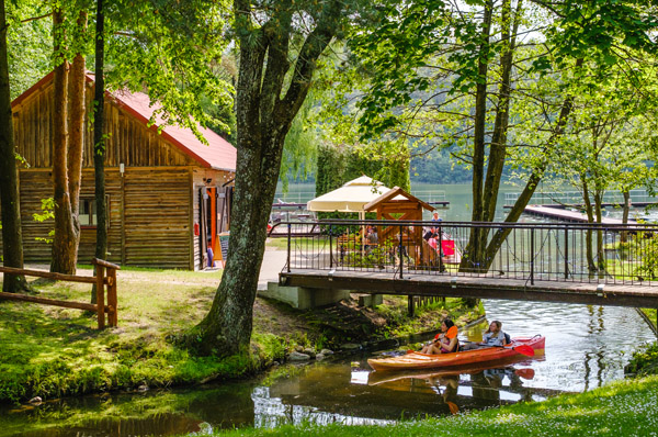 W naszym ośrodku znajdziesz 47 drewnianych domków z pełnym węzłem sanitarnym, stołówkę, sale konferencyjne i eventową, tawernę, namiot, miejsce kąpielowe dla dzieci, plac zabaw, boiska sportowe, miejsce na grilla i ognisko, gry zręcznościowe, wypożyczalnię sprzętu wodnego i rowerów górskich oraz parking. Możesz łowić ryby, spacerować po lesie, jeździć na rowerze czy pływać kajakiem. Ośrodek jest świetną bazą wypadową do zwiedzania regionu.